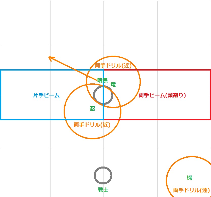 ・両手ドリル:近い方は忍と竜がブロ殴りつつ誘導、遠い方は機が南東側に誘導