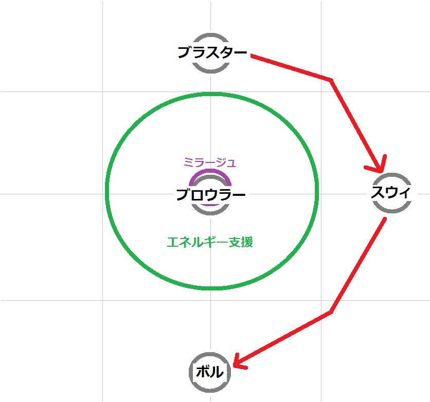 スウィンドラーをキャッチしたら、そこでブラスターを削り切り倒す。キャッチ直後は結構攻撃が痛いので戦士は防御バフ推奨。ブラスター撃破と同時くらいにハイト→アタッチメントと続けてくるので落ち着いて処理する。ここでのアタッチメントは下図のように処理する。