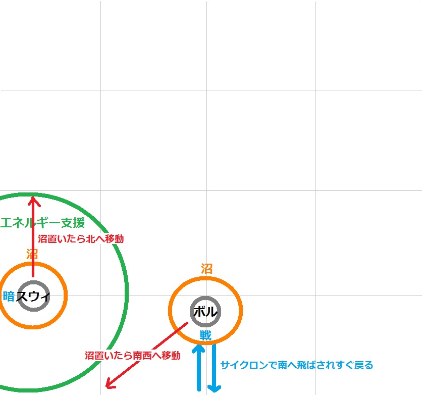 サイクロンで吹き飛ばされる時にスウィ組はそのまま壁際にいれば問題無いが、ボル組は南へ飛ばされるよう位置を調整し、吹き飛ばされたらすぐに元いた位置へ戻る。(サイクロン発動後続けてジャミングの詠唱が始まるのでボルはその場からすぐ動かない)サイクロンから約15秒後にミサイルが発射されるのでスウィ組・ボル組はそれぞれ固まり円状予兆をまとめて置きつつ、スウィ組は北、ボル組は南西へ移動して沼を避ける。