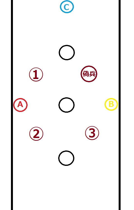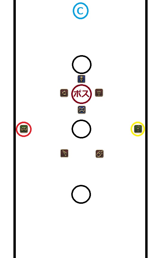 全員に「必中の決意」という(円形範囲の10000~15000のダメージ)攻撃がくる。重ねて食らうと耐えられないので散開して処理する。以下散開例。