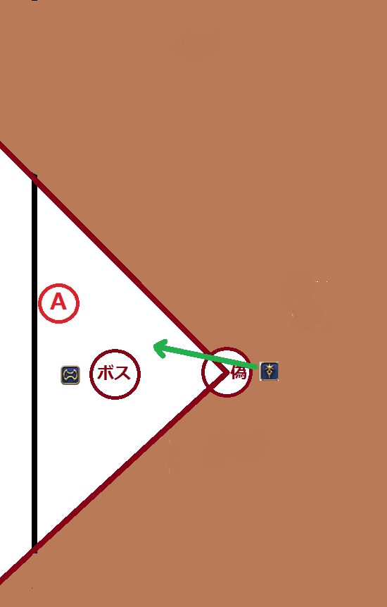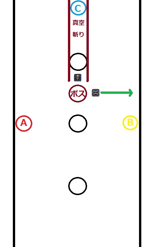 暗黒はその場から動かずに12時方向へ向けて「ゴブ流真空斬り」を撃たせる形でリビングデッドを使い耐える。戦士はタゲを取ったら上図の緑矢印の方向へボスを引っ張ることを意識しておく。