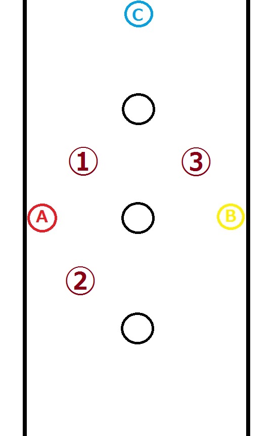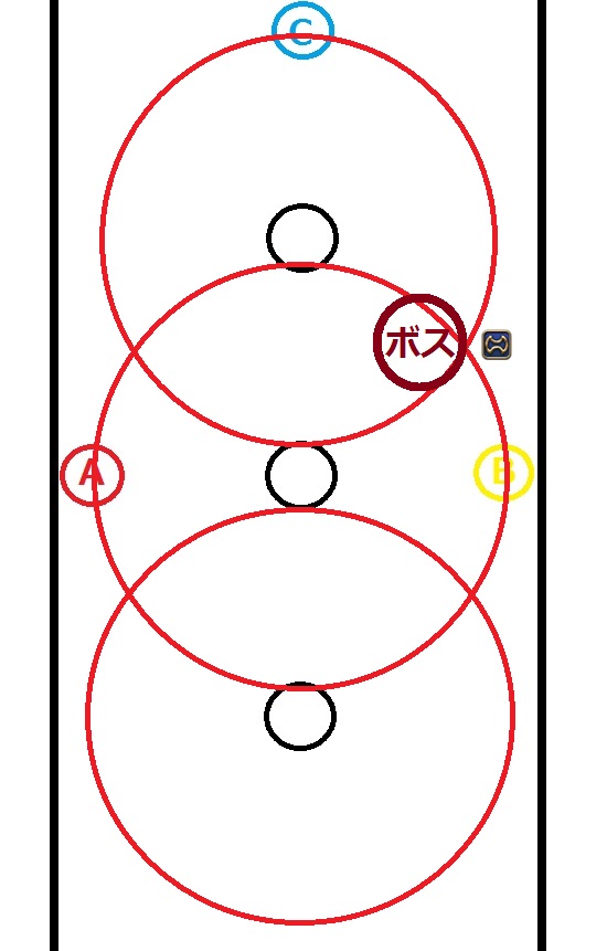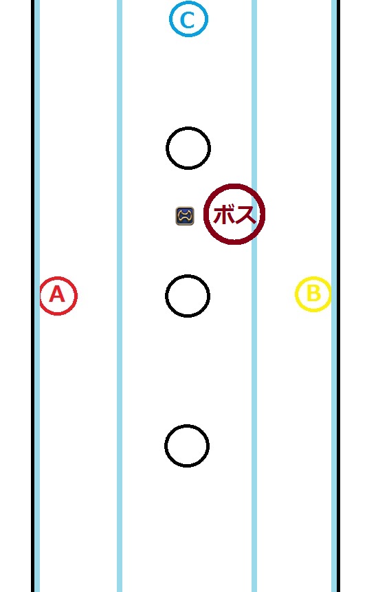 上図のように上下に長い部屋となっており、ABCマーカーを12時、3時、9時に置く。部屋の両サイドには常にダメージ床が発生しており、入ってしまうと「感電(DoTダメージ)+麻痺(治療不可で15秒)+スタン(3秒)」を食らってしまうので、この部分を踏まないように進めていく。