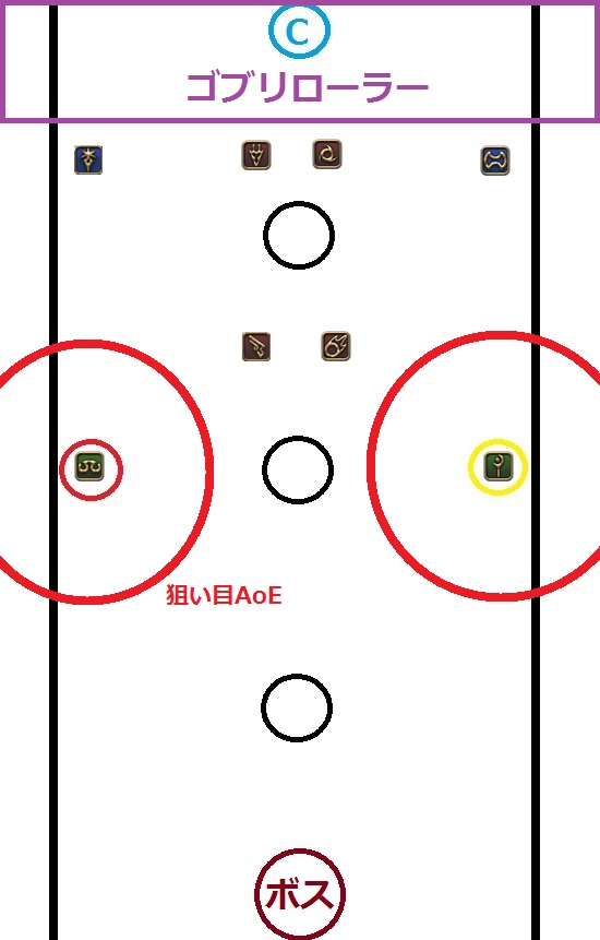 上図のように安置へ移動しておく。ボスの位置は南にいることもあると思われるが、「回転ノコギリ」の安置になっていれば特に問題ない。「ゴブ流後の先」が終わったらキャスLBをボスと雑魚に当てて処理する。(当てる前に雑魚に被ダメ上昇デバフが付与されているか要確認)微妙に雑魚のHPが残ることがあるが、「ゴブ爆発」される前にしっかり倒しきっておく。DPSはボスを殴る際に、「回転ノコギリ」と降ってくる鉄球に当たらないよう要注意。タンクはDPSが殴りやすいように位置調整してあげると尚良。