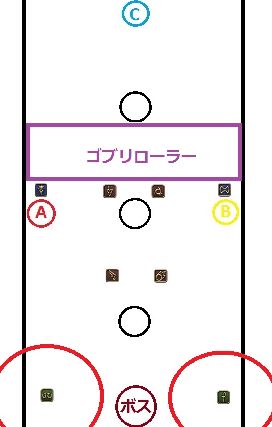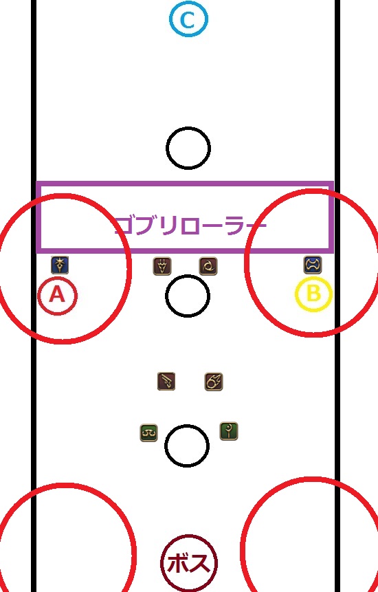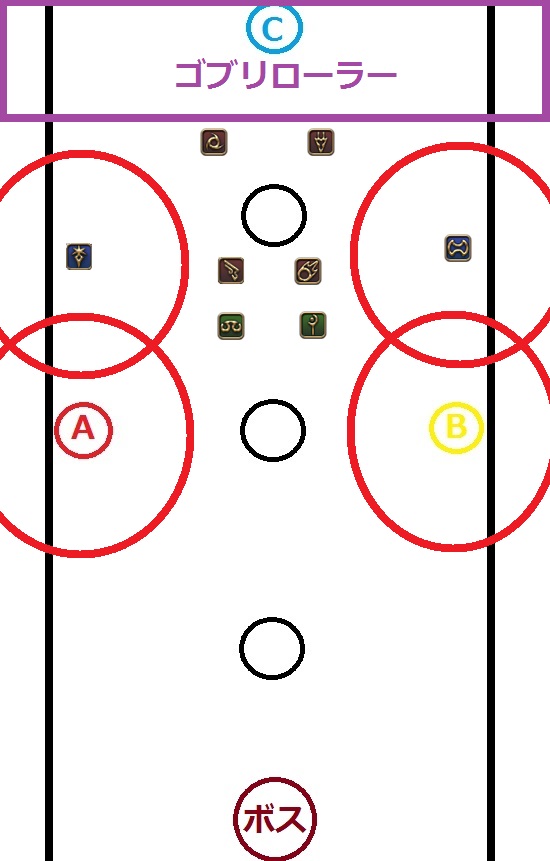「イルミナティ・ハンドカノン」を避けつつ、上図のような配置で処理する。フェーズ4最後の「ゴブ流大激震」が終わったらあらかじめこの配置になるように移動し始めておく。