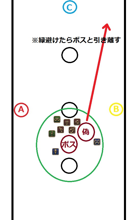 ・赤【ボスから離れる】→ 青【散開】 → 緑【ボスに近づく】