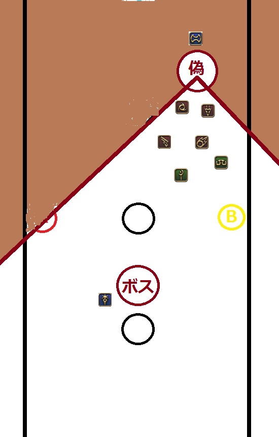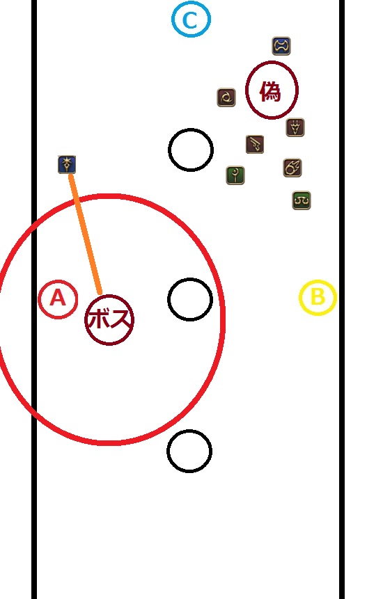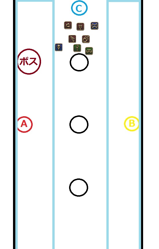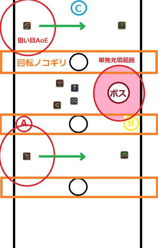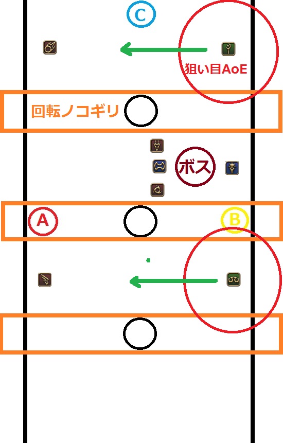 ヒラはそれぞれ図の位置に「狙い目」AoEを捨てたら学者は機工士に、白は黒に「マーキング」デバフを渡しに行く。タンクと近接DPSは間のラインでボスと戦闘。