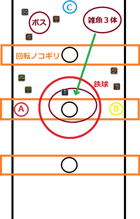 ST(暗黒)は雑魚のタゲを取ったらすぐに鉄球罠を踏みにいく。他の人はこの後「回転ノコギリ」が出現するので、安置へ移動しておく。
