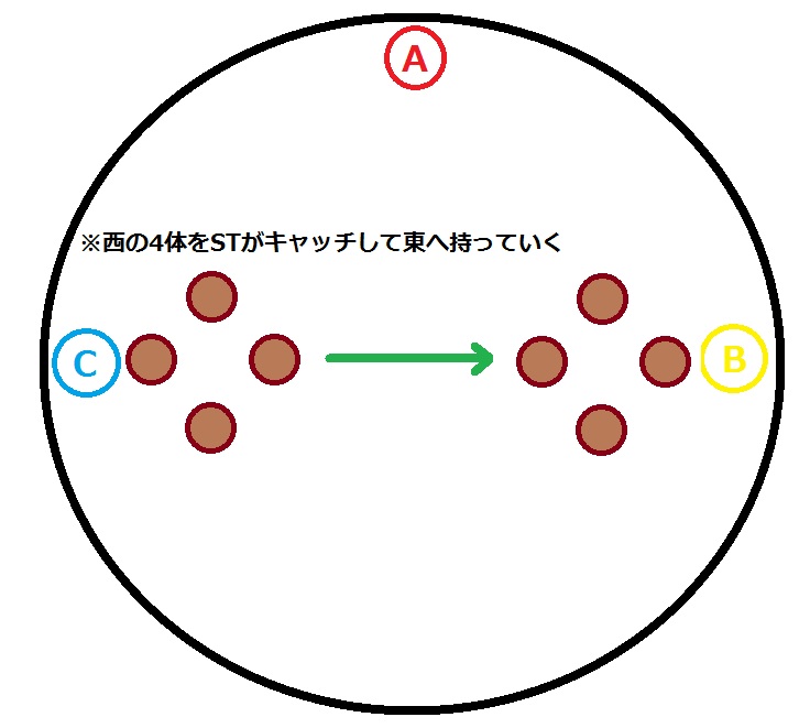 西に出現した4体をSTがキャッチして、東の4体をMTがキャッチ。STはキャッチした4体を東まで持っていき、そこで8体をまとめて処理する。