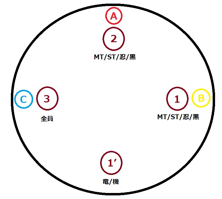 黒 → 集団罰対象のDPSが機ならA、竜ならB、忍ならC、自分なら左円