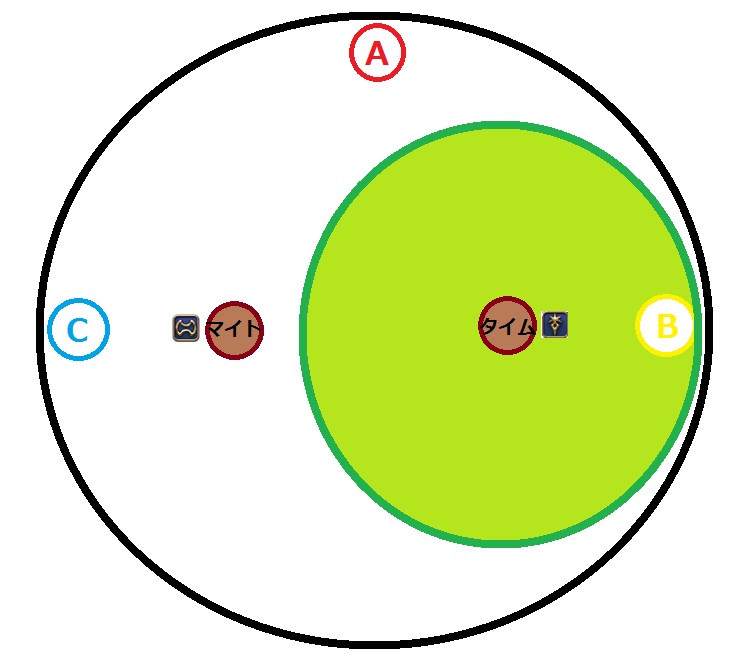 「時間停止」の処理が終わり、時間が再び動き出すと同時に「重力異常」の黒いAoE(小)が出現するのでボスに近づきつつ安置を探しておく。