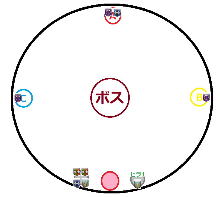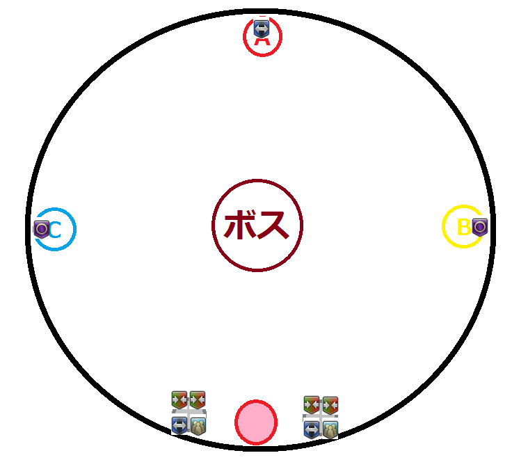 上図のようにABCマーカー(図ではボスに隠れているがAマーカーが北)を置き、開幕はボス「アレキサンダー・プライム」を中央で固定。