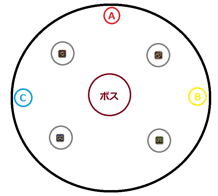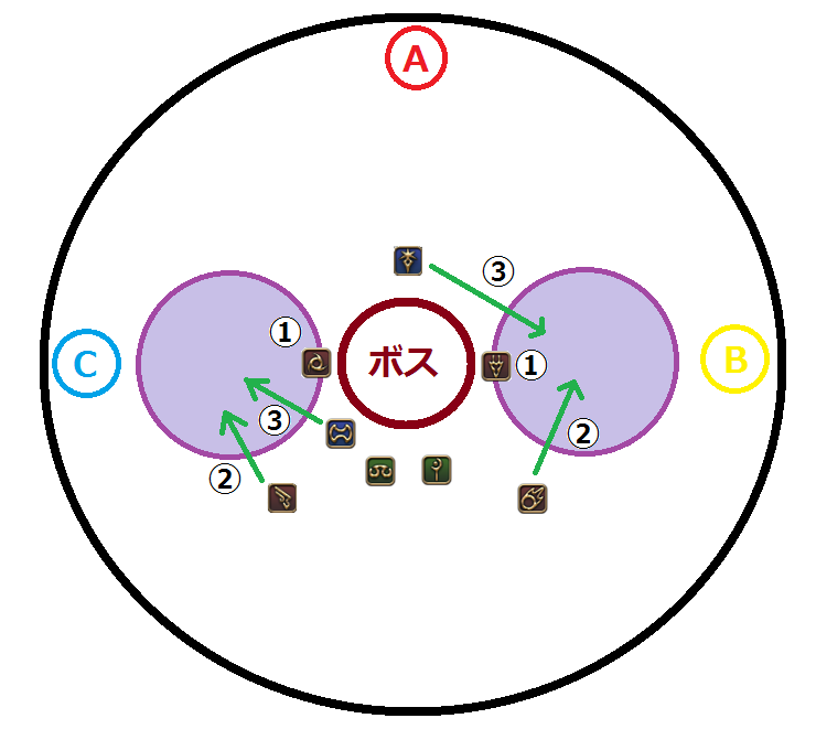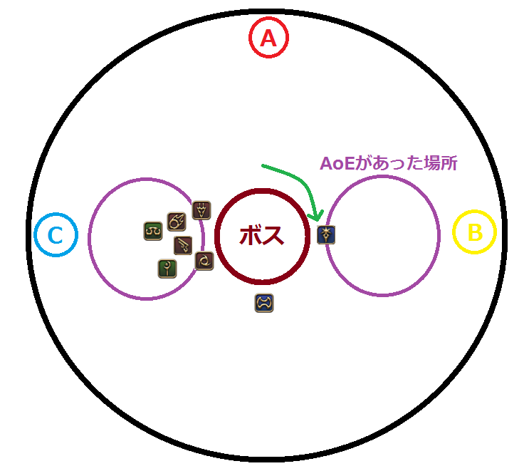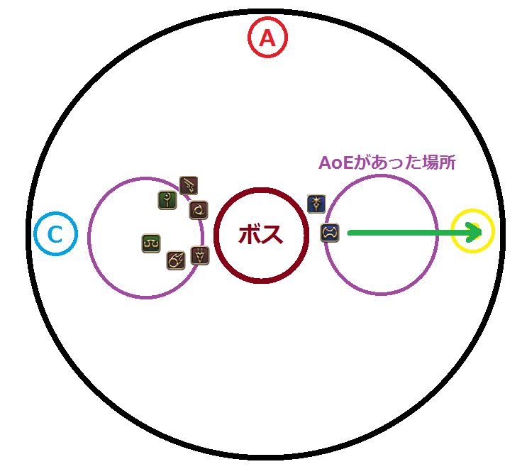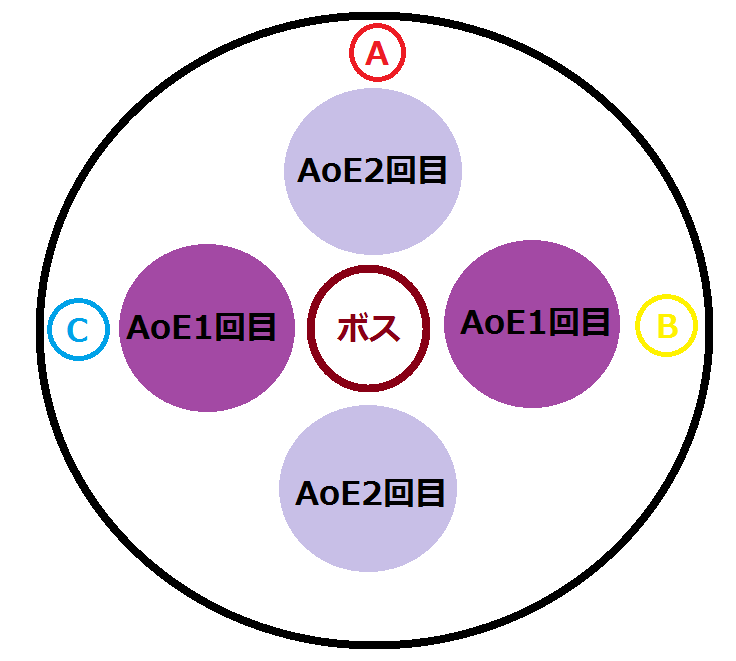 上図のように1回目がBマーカー側(東)とCマーカー側(西)なら2回目はAマーカー(北)側と南側にAoEが出現する。暗黒がボスの向きをAoEのあった方にして、戦士がその位置へ誘導するのはこのためである。予めその位置にいれば2回目のAoEが出現した時点でボスの向きを変える必要が無くなる。