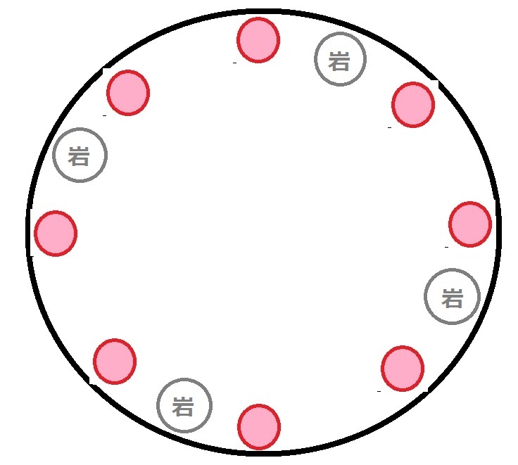 「フェーズ4で岩処理に成功していれば」というのがどういうことかというと、まずボスが再出現する位置は下図の8ヶ所(赤丸の位置)の中からランダムで選ばれる。