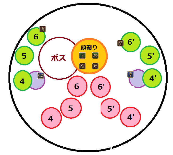 タンクは名誉罰なら9時、それ以外なら3時。ヒラはどの場合も3時と判断が楽。DPSには接近強制(禁止)命令しか付かないが相方のデバフを見て判断する必要がある。とりあえずどのロールも接近強制命令なら3時でいい。接近禁止命令の場合だけ注意する。場合によっては接近強制命令が6人になることもあり、そうなると集団罰(頭割り)を7人で受けることになるので楽であるが、逆に接近禁止命令が多い場合は少し大変。距離減衰ダメージもあるので要バリアヒール。