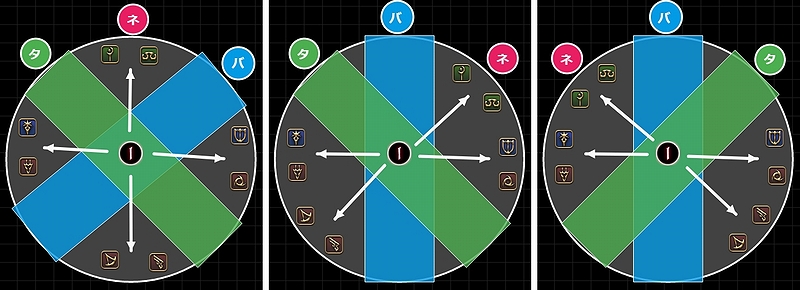 例えば、ネールが中央にいる場合の散開(上図左)を見ると、ネールを12時としてヒラ2名は12時、ナ忍は3時、暗竜は9時、遠隔2名は6時に散開しているが、これをヒラ2名はネールの正面、ナ忍は3体の向かって右側、暗竜は3体の向かって左側、遠隔2名はネールの真逆へ向かって移動する、と考える。そうすれば、3体の配置がどの場合でも同じ動きをすれば安置へ退避することになる。