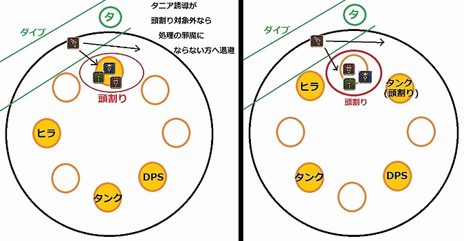 ツインタニアの緑マーカーが付いた人にも頭割りマーカーが付くことがあるので、その場合は緑マーカーが付いたらすぐに誘導位置から頭割りへ集合する。(緑マーカーが出た時点でダイブ誘導は出来ている)
