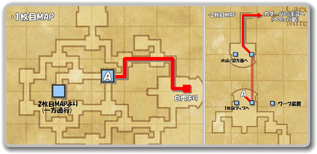 赤いルートを通ってAへ向かい、そこからワープすると上図右の2枚目マップAに着きます。
