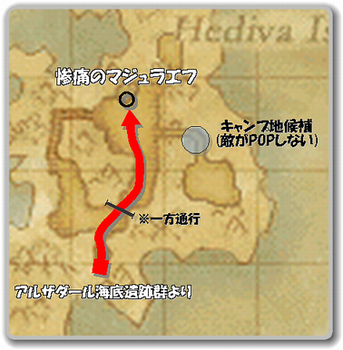 ヘディバに出たら上図の赤ルートを辿り、黒丸へ。座標で言うと(H-7)。