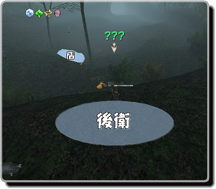 「???」の後ろ辺りに壁を背に出来る位置があるのでノックバック対策にそこへ盾。