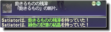 倒すと「飽きるものの残滓」を100%と「緑色の記憶の結晶」をドロップ。