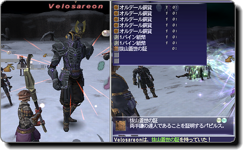 今回も通常のAF取りに加え「Quiebitiel」(楽器等)と「Velosareon」(両手鎌等)の2体の証NMを討伐。