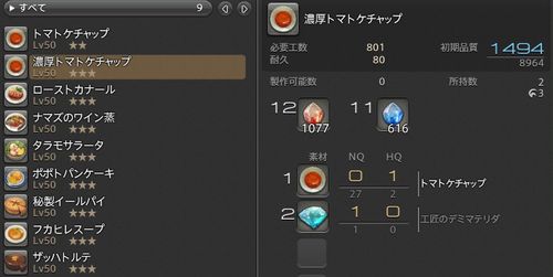長らく放置していた秘伝書2の残り、調理と錬金を一気に終わらせた。工ダは使いきっていたのでマケで調達。相場は28000と安くなったとは言え、錬金で運悪く詰まってしまい、結局両方終える頃には100万以上飛んでいた。90%のリクレイムを何度も失敗し、80%以上あるのにNQを引いたり…相変わらずこのゲームの確率は信用出来ないが、とりあえず終われてすっきり。ベーコンエピでも作ろう。