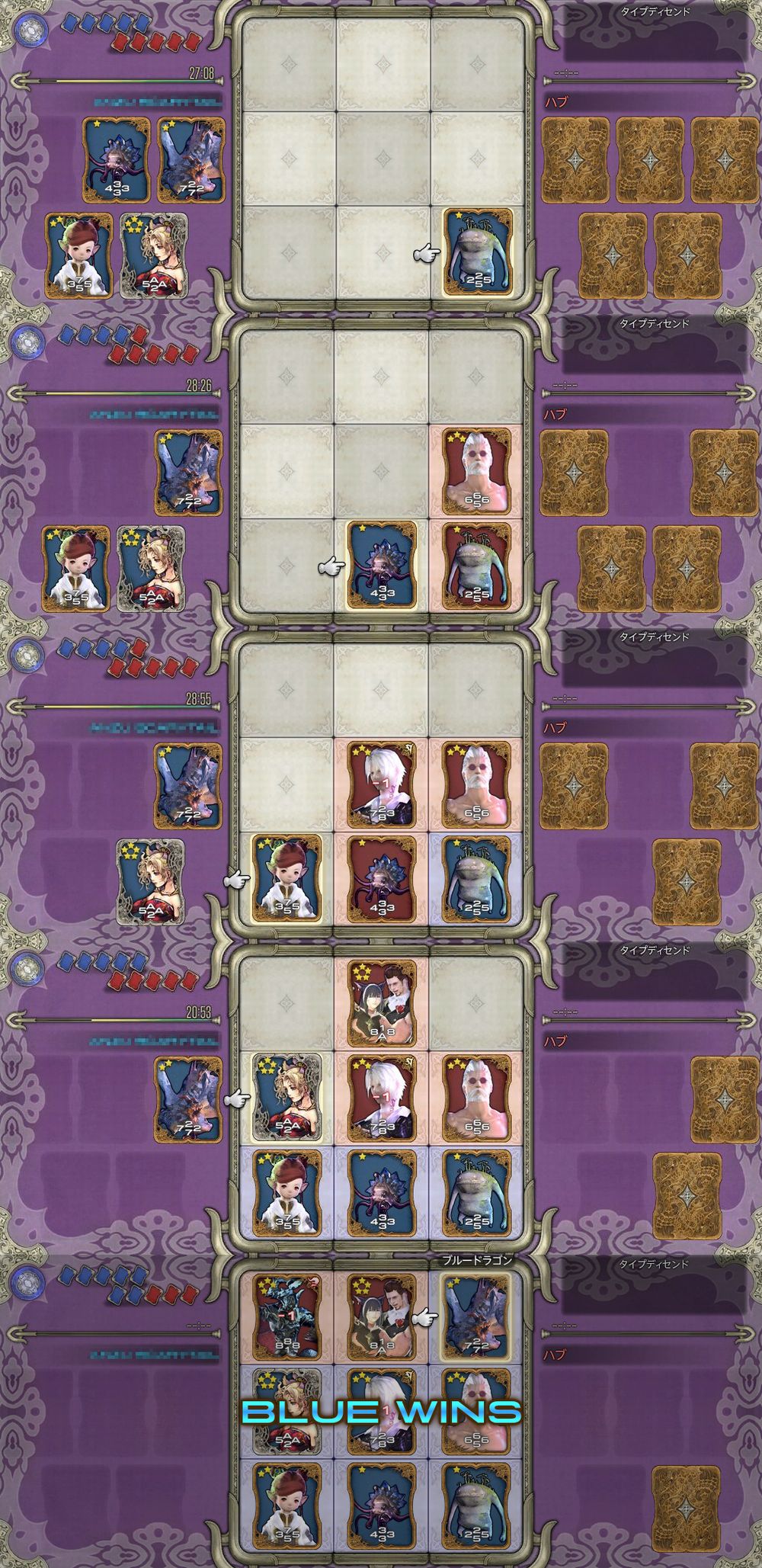 | ハブ攻略 条件:☆3解放 必要カード:ベヒーモス、ギルガメッシュ、ゴッドウィル、角尊、オニオン 先制:ゴッドウィル中央 後手:ベヒorギルガメで必ずめくる 角尊:主な役目は隙間埋めつつめくり オニオン:オーディンが来た時に使うか後半に二枚めくるチャンスに使う ラウバーンが控えてそうなら左上を開けておくこと ------------------------------------------ 1.先行時トンベリを右下(3)に 2.相手がトンベリにちょっかいだしてきたらコブラン(2or6)で応戦してトンベリを確定 3.さらに相手がコブランにちょっかいだしてきたらギルガメかベヒを1か9に置く 4.ティナで相手の攻撃を封じる 5.勝ち確定 |