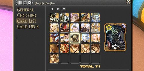 今日も帝国兵と対戦。始めてから1時間程経った頃、ようやくガイウスが出る。通算238勝目でのドロップ。確率的には1%以下…。とりあえずこれで残るカードはゴールドパックの★5、MGP140万分の2枚、大会30勝のシャントット、そして大会賞品4枚の合計9枚になった。これらはすぐに取れるものではないので、カード収集は一旦終わりにしておく。これでようやくチョコボレースを触れるということで、早速始めてみたが…新鮮なのもあるだろうけど、結構面白い。正直カードより好きかもしれない。当分はチョコボやると思う。