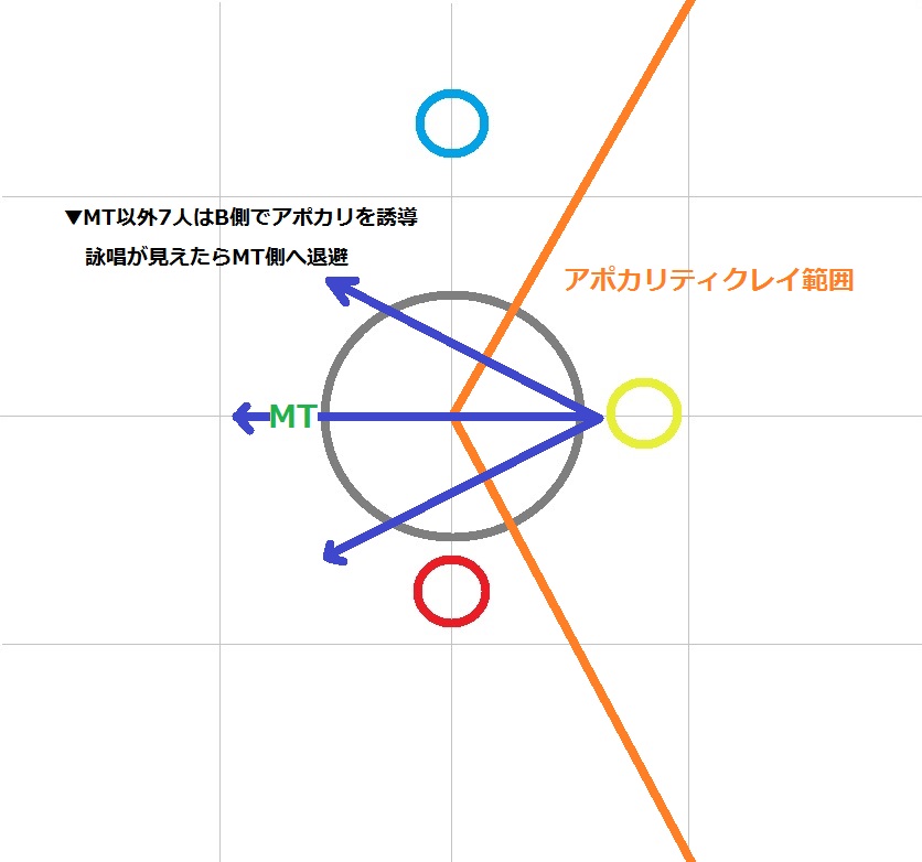 アポカリティクレイ発動中にMTはP3開始時の位置(C側)に戻り、他7人はAを経由しながらBに戻る。(12時側を経由すると戻りが遅い場合2周目の火炎放射に当たる恐れがある)