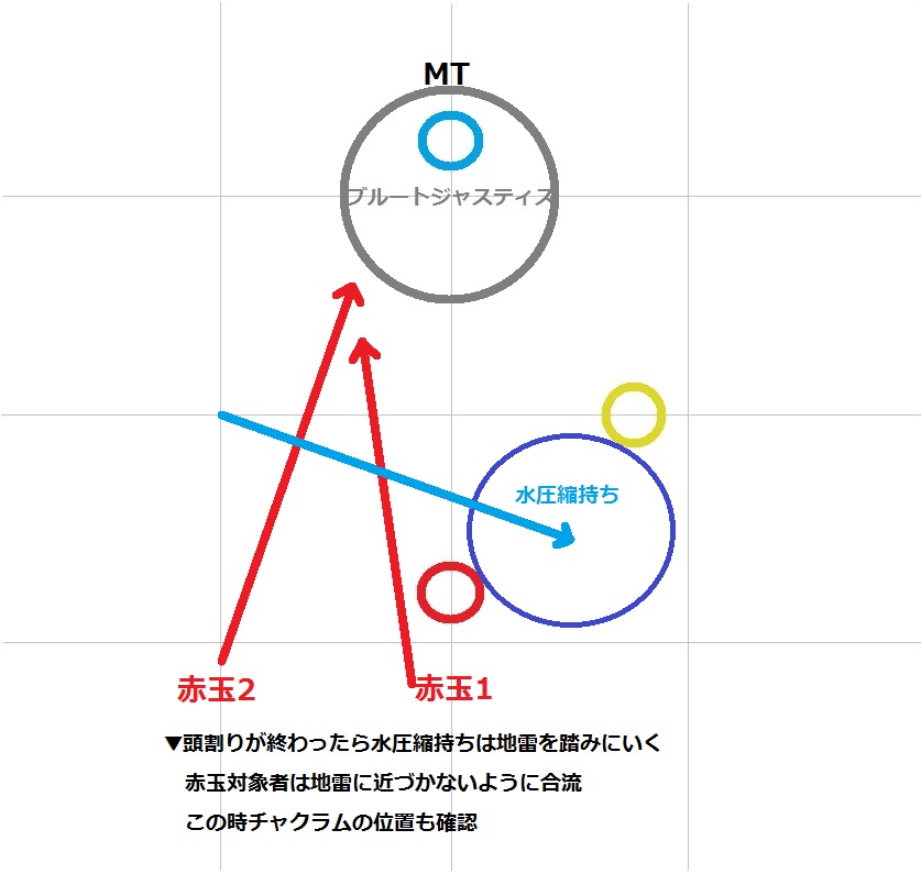 AoEの予兆が出たら頭割り組は地雷とは逆側のブルートジャスティス側面に移動し、そこで頭割りをする。ここのAoEは1回しかこない。図では地雷が右下になっているが、左下や左上に地雷が設置されることも当然あるので、その場合は右側で頭割りをする。頭割り&赤玉の爆発と同時に大火炎放射がきてブルートジャスティスが一時的に立ち止まるので、そのタイミングで頭割りをすれば丁度いい。その間にMTは地雷から距離を取るために徐々に北側へ移動しておく。
