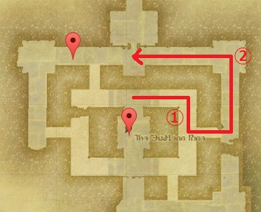 最初の骨3体を持ちつつ(そこのスイッチはDPSorヒラが押す)上から挑発で2ボス前扉にいるトンベリ2体を釣る。そのまま①まで行き、そこにいるお化けごと骨3体とトンベリ2体をまとめて処理。終わったらタンクは②にいる骨とお化け(+その辺りにいるデカトンベリもタンクがわざと絡まれて引っ張る)を持ちつつ2ボス前扉で待機し、DPSorヒラがスイッチを押して2ボス部屋へ。骨とお化けはボス部屋から閉め出すかボスごとまとめて処理。