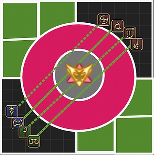 詠唱完了と共に赤マーカーの付いた円状予兆が3名に、頭割りマーカーが1名に出現する。対象はランダム。そして、赤マーカー2名と、赤マーカー1名と頭割りマーカー1名が線で繋がれる。(赤赤コンビと赤頭コンビが出来る)