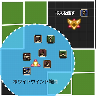 図は処理例。「ホワイトフレイム」はPOPしたその場で即倒す。MTはボスを一旦「ホワイトフレイム」がPOPした場所から逆側へ離す。この際、茨パネルのほうへ引っ張らないよう注意。STは、「ホワイトフレイム」の攻撃がかなり痛いのでバフをしっかり使う。