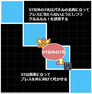 全員②のパネルに集まって(MTは「女王の舞い」の詠唱中に)「クルルルル!」を南東側へ撃ってくるよう誘導する。