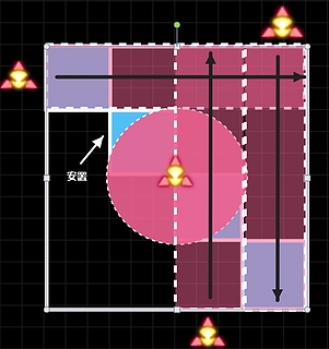 図で示した通り、中央の①②パネルが安置だった場合は「クロスリーパー」(円状範囲)の範囲も含まれるので安置が狭いため注意が必要。