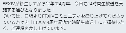 このような形で生まれた「ペコろぐ。+1」(紆余曲折を経てタイトルの後ろに+1が付きました)ですが、実は6月の終わり頃「FFXIV 4周年記念14時間生放送」に「ペコろぐ。+1」の管理人として招待されていました。いつの間にか情報解禁してもいいようなので、この場にてご報告させて頂きます。