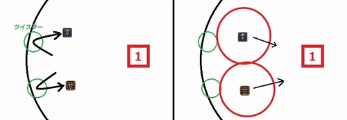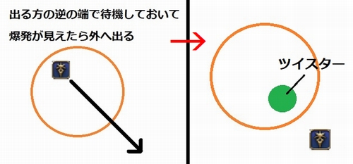上図右のパターンは頭割り位置に「塔」が出ていない場合。この時も頭割りは同じ位置で行い、頭割りが着弾したら(爆発のエフェクトが見えたら)、頭割りタンクはすぐに近くの「塔」へ入り、他の3人はそのまま邪魔にならない方へ抜けてツイスターを捨てる。