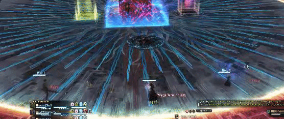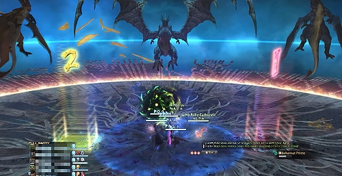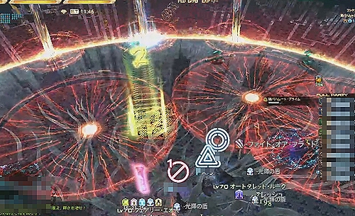 続いてネール戦開幕(天地崩壊)の「中央に柱落下→全員ノックバック」という流れがくる。更にその約2秒後、外周に出現している8つの「塔」が同時に爆発するので、全員が別々の「塔」にノックバックの反動で直接入る形にならなければならない。