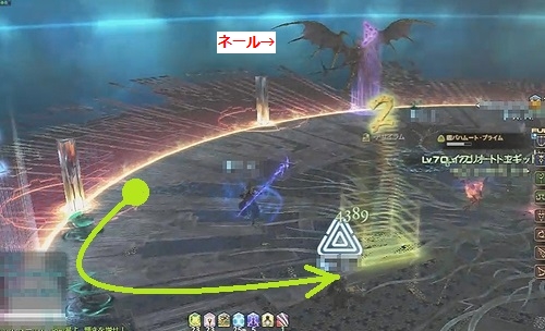 「外周へ向かう~ツイスター避け~中央付近へ戻る」この流れの中で「ネール」の位置を確認しつつ、外周に出現する「塔」の配置をよく見ておく。迂回している最中、外周からなら全体を見渡せるので、位置も確認しやすい。