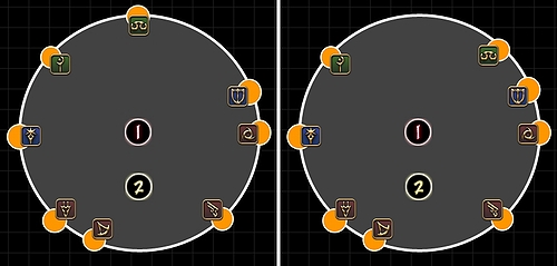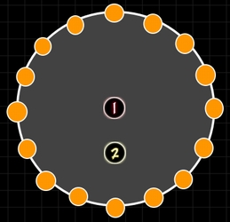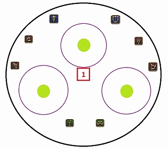 上記の条件で処理した例が上図。ネールの位置(12時)に丁度「塔」が出現する場合があり、その時は、その「塔」を学者が担当するようにする(時計回り1つ目の人)。この例は比較的綺麗に「塔」が配置された場合のものだが、場合によっては片側に物凄く偏っていることもあるので、前述したように、外周側から(若しくは中央に寄ってから)予め「ネール」と「塔」の位置をカメラを大きく回してしっかり確認しておく。