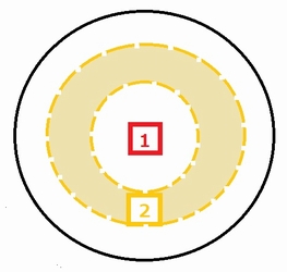 逆に自分のすぐ近くに最初の予兆が出た場合(上図白の位置)は、予兆のすぐ隣で待機しておいて、予兆が爆発したらその位置へ飛び込む。するとそこはもう安置なので、そのまま真っ直ぐ中央へ向かうだけでいい。