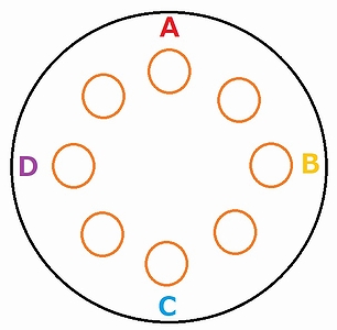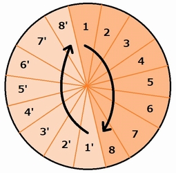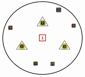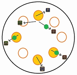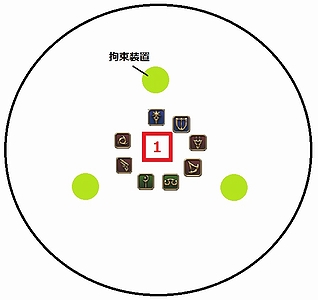 「塔」の出現位置は外周の16ヶ所(上図参照)からランダムで8ヶ所が選ばれる。「塔」の位置がランダムなので、あらかじめ誰がどこを担当するかを決めることは出来ない。そこで、ネールの位置を12時として左右に4人ずつ分かれ、各自入るべき「塔」の目安を決めておく。