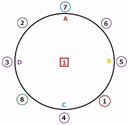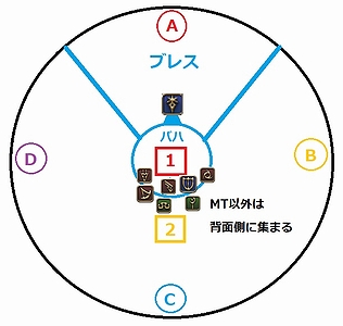 5体がどちらに回るかがギミック処理に必要な情報になるので、バハの位置がどちらのパターンか判断しやすいよう、このフェーズになるまでに東西南北にA~Dのマーカーを置いておく。そうすれば、マーカーの上を見るだけで判断出来る。(マーカー上にバハがいれば反時計、いなければ時計)