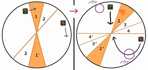 上図左のパターンはネール正面(頭割りをする位置)に丁度「塔」が出ているので、頭割り対象のタンクはそこで頭割りをしたあと、そのまま待機しておいて「塔」を踏む。「塔」が爆発したら前述通りのやり方で外へ出る。(タンクは頭割りの爆発で出ないよう注意、頭割り爆発→塔爆発の順)他の3人は頭割りの爆発が見えたら「塔」から先に出ておく。