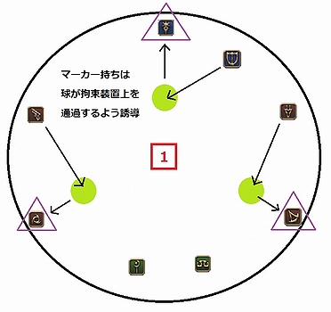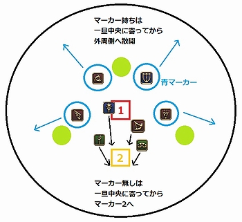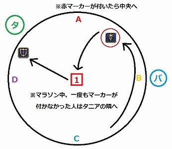 そして、この時点で一度もマーカーが付かなかった人が1人いるので、その人は中央に寄った勢いでそのまま外周にいるツインタニアの隣まで移動し、この後くるダイブ誘導の為に待機しておく。マラソンと同じ方向に誘導すると、バハのダイブに当たることもない。(例えば反時計回りのマラソンならタニアを12時として11時側に立つ)