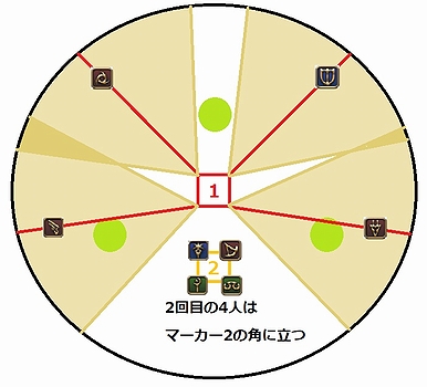まず、ダイブ2種がエリア中央を通るように誘導させるため、「天地の三重奏」詠唱中に全員中央(マーカー1)に集まっておく。そして、下図のように散開して処理する。