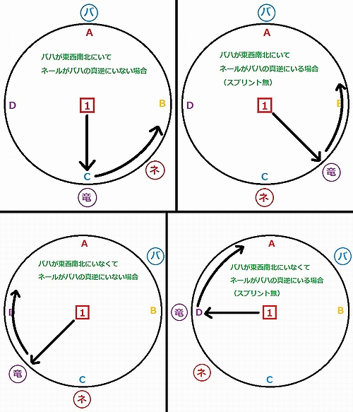 確率的には低いが、一つだけ例外があり、バハの真逆に出現したのがネールだった場合はスタート位置を一体分ずらす必要がある。(そうしないとネールのダイブに当たる)時計回りの場合は、ネール向かって右側、反時計回りの場合は左側へずれて、そこからダイブが見え次第走ればいい。