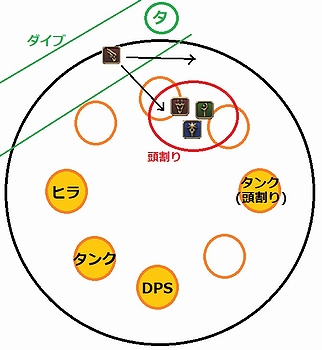 ツインタニアの緑マーカーが付いた人にも頭割りマーカーが付くことがあるので、その場合は緑マーカーが付いたらすぐに誘導位置から頭割りへ集合する。(緑マーカーが出た時点でダイブ誘導は出来ている)