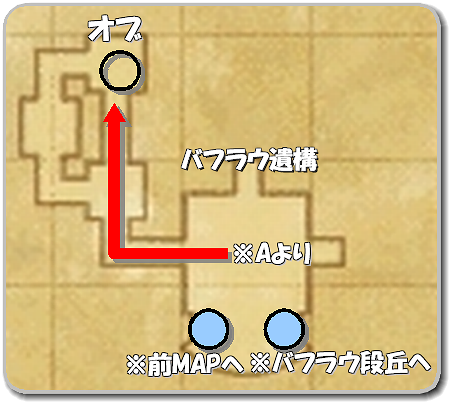 前のマップへ戻れます。ちなみに右側のワープへ飛ぶとバフラウ方面へ出られます。