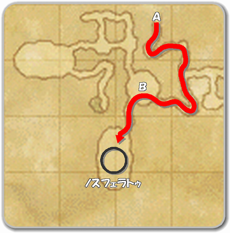 すると、上図Aに出るので、赤ルートを辿り黒丸で囲んだ場所(F-9)を目指しましょう。